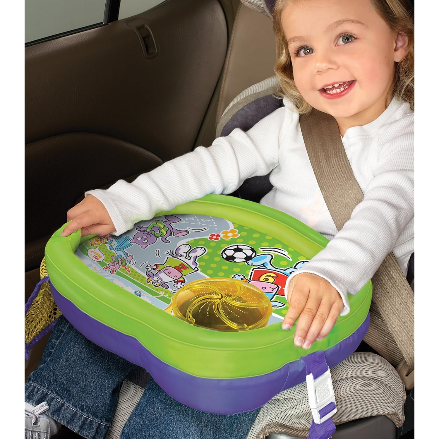 Its kind of hard to color or play with toys on your lap when its the size of a preschooler's, so I recommend giving them a surface to play on by purchasing a travel tray. I have this tray from Babies'R'Us and I love it! It clips on and off easily so it stays in place while using it but is simple to remove when they need to get out. The bottom is stuffed with cotton so its super comfy on their little legs. The mat and snack cup are removable so it is very easy to clean. Finally, the very best feature is... the side wall! The lip is about an inch and keeps Hot Wheels and crayons from rolling off the tray and onto the floor every five seconds despite the wiggling creature underneath it.
